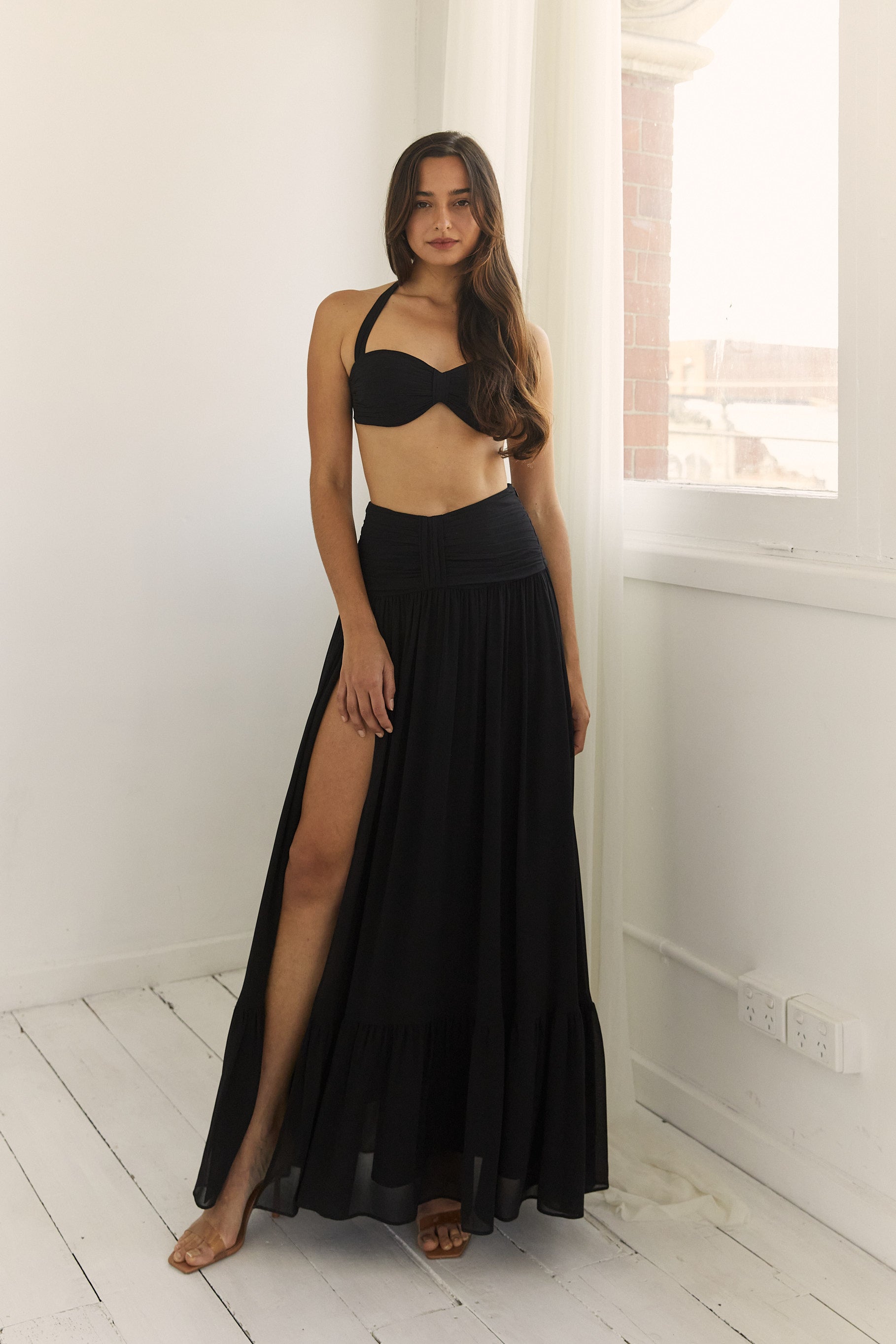 Introducing Cartia, the perfect harmony between sensual & elegant. She’s an exquisite two-piece set featuring an adjustable crop and mid-rise maxi skirt exuding sleekness and sophistication. Designed from a soft and flowy georgette, adorned with intricate draping across the halter bodice and skirt to infuse a touch of romance. Finished with a flattering leg side split and statement floor sweeping skirt. The Cartia set is the masterpiece for your next stand out event, promising to leave a lasting impression.