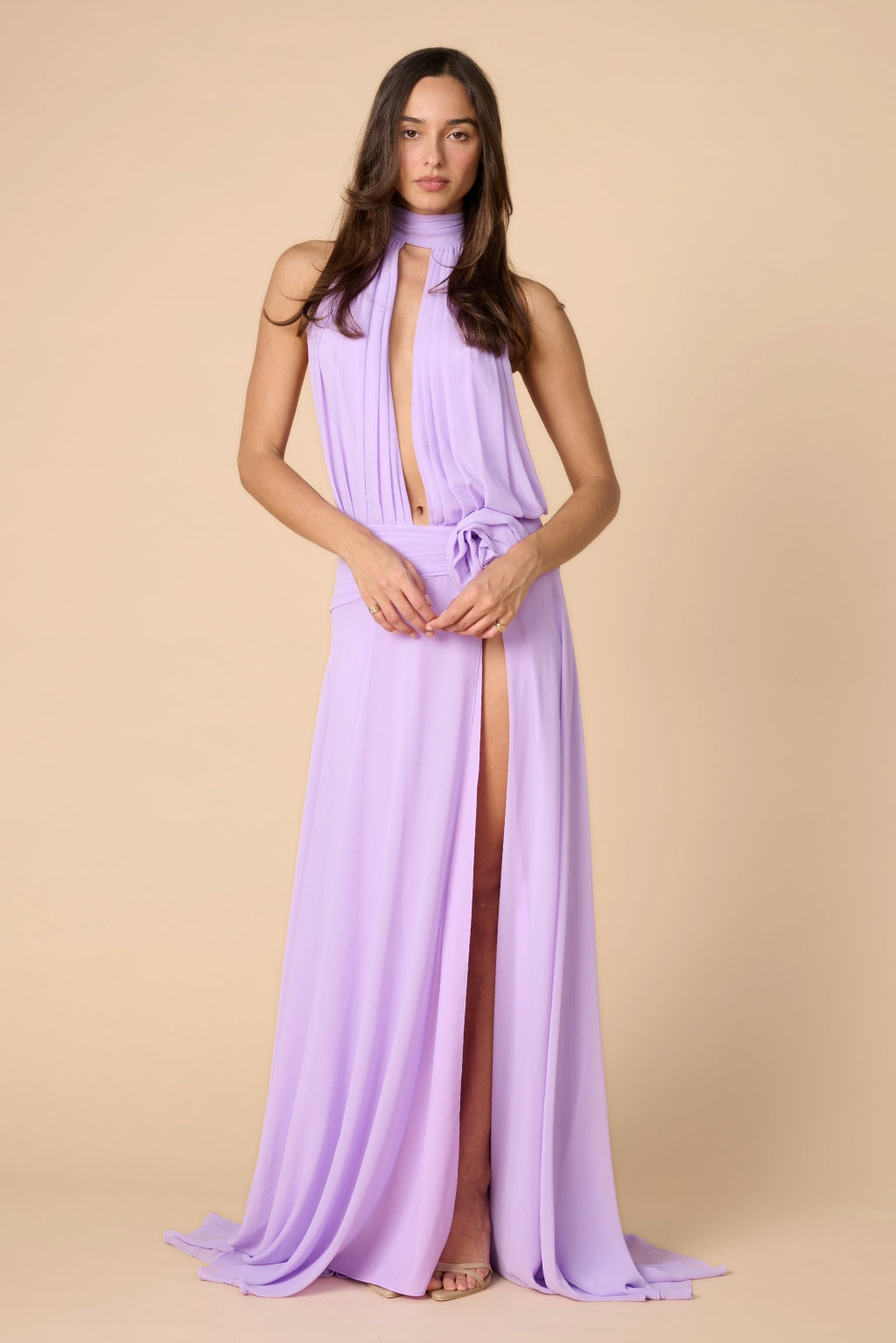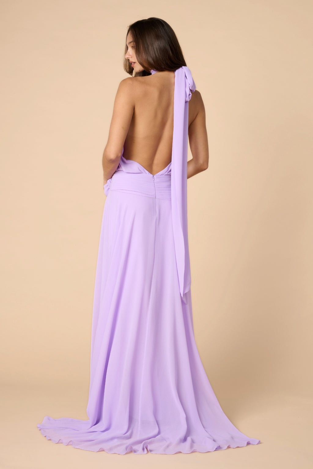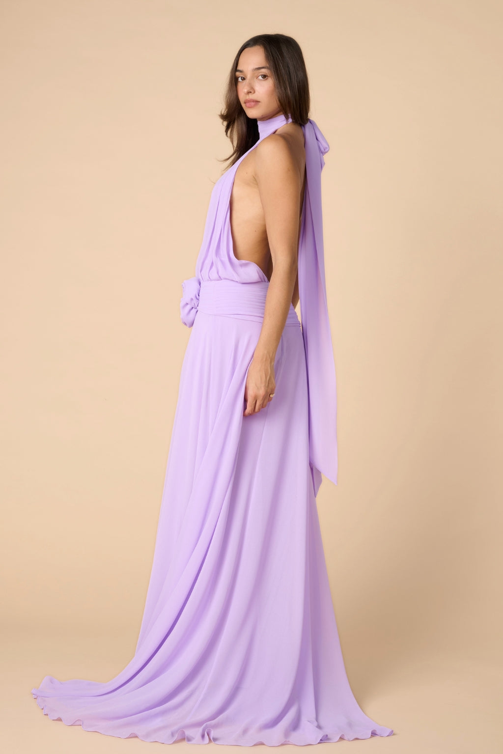 Introducing Solaia, a romantic vision in soft lilac. Designed to captivate, this floor-length gown is crafted in weightless chiffon that drapes effortlessly over the body, creating a fluid and ethereal silhouette.