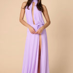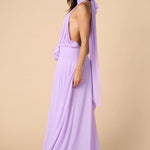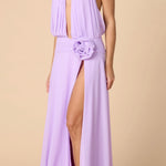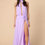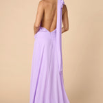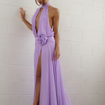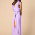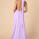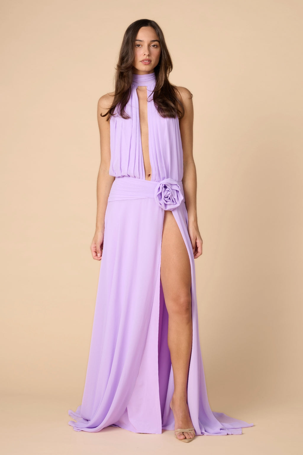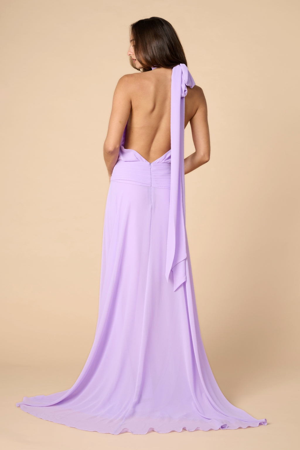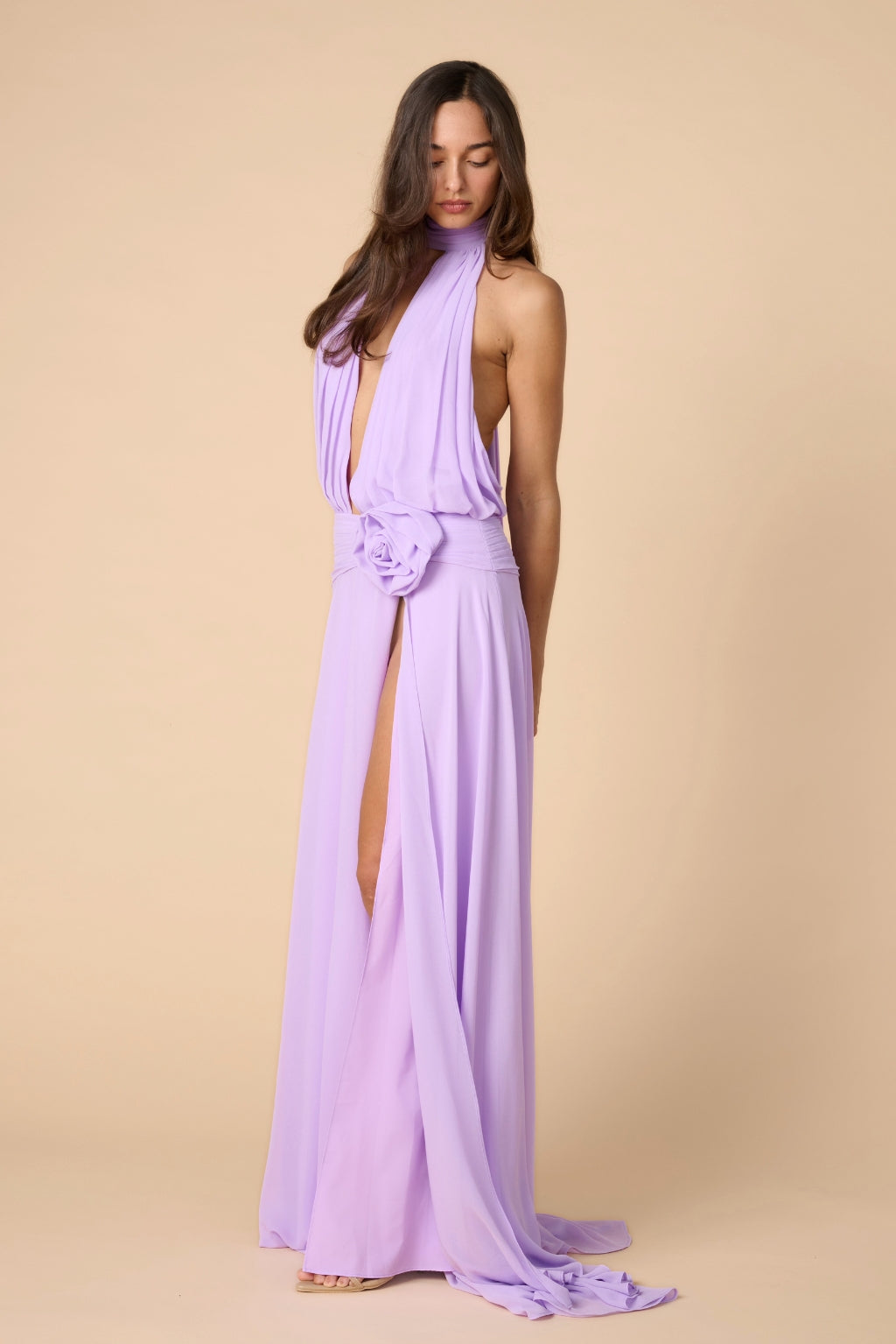 Introducing Solaia, a romantic vision in soft lilac. Designed to captivate, this floor-length gown is crafted in weightless chiffon that drapes effortlessly over the body, creating a fluid and ethereal silhouette.