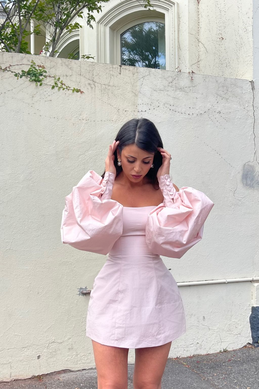 This drop dead gorgeous mini dress is made from a luxurious baby pink Taffeta. The Nevalia Dress is the dress of the season. Extravagant pin tucked puff sleeves is what makes this dress a one of a kind style. A beautiful bodice corset for a snatched waist emphasised by a Victorian puffed skirt to accentuate the waist. This mini was made to make a statement!